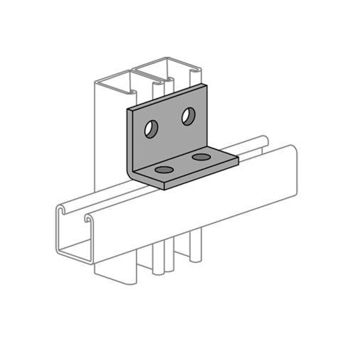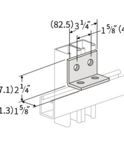 The4-Hole Fitting is a compact L-shaped bracket designed to connect two strut channels at a right angle with minimal footprint. As illustrated in the diagram, this bracket joins a vertical channel to a horizontal channel with dual mounting holes on each plane, spaced precisely at 1-5/8″ (41.3mm) to align with standard 1-5/8″ strut profiles.